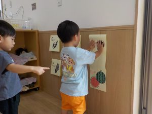虫の展示では、実際に保育園の近くの公園にある木の枝や、虫を展示しました。虫籠の中にいるカブトムシやクワガタを見て「触ってみたい!」と触れてみる姿もありました。ちょうちょを見ると、「ぱたぱた!」と羽の動きを真似する仕草をして楽しむ姿もありました。蝉の抜け殻は「あ、これ知ってるよ。蝉のからっぽ!」と言いながら木の枝につけて楽しんでいました。