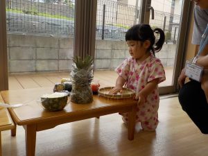 野菜の展示では、夏野菜を展示しました。「コーン!食べたことあるね。」とご家族と知っている野菜を伝え合ったり、野菜の断面を不思議そうに見る姿もありました。パイナップルを見ると「とげとげ!痛いかな?」と感じた事を言葉にしている子もいました。