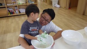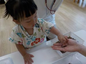 小麦粉粘土コーナーでは、小麦粉と水と油を混ぜて小麦粉粘土を作りました。粉のサラサラとした感触から水を加えてベタベタと感触が変わることに驚いた表情を見せたり、こね続けて柔らかくなってくると「気持ちいいよ!」と言葉にしながら感触を楽しんだり、できた小麦粉粘土をちぎったりして楽しんでいました。