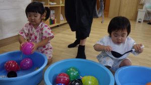 ヨーヨー釣りコーナーでは自分の好きな色をじっくりと選び、おたまですくうことができると「やったー!」と嬉しそうにしていました。