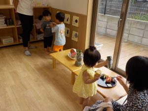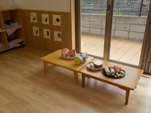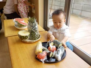 野菜の展示では、夏野菜を展示しました。「コーン!食べたことあるね。」とご家族と知っている野菜を伝え合ったり、野菜の断面を不思議そうに見る姿もありました。パイナップルを見ると「とげとげ!痛いかな?」と感じた事を言葉にしている子もいました。