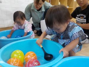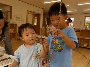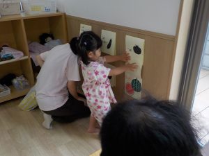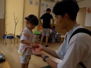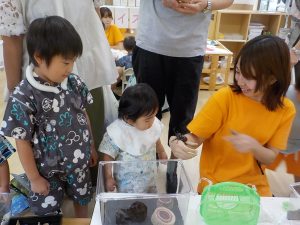 夏祭りでは、五感を使って夏ならではの経験ができるように、夏の虫・夏野菜展示コーナー、小麦粉粘土コーナー、ヨーヨー釣りコーナー、絵の具やクレヨンを使ったアイス作りコーナーを用意しました。