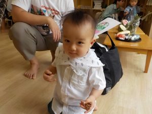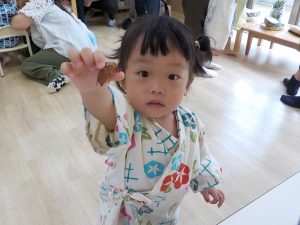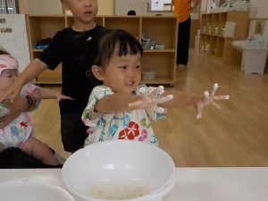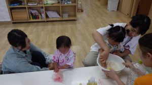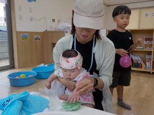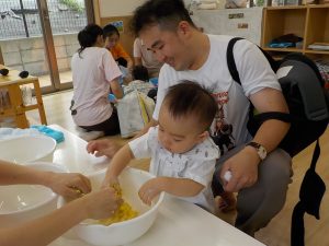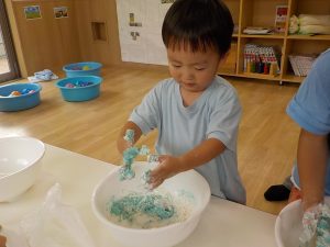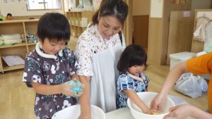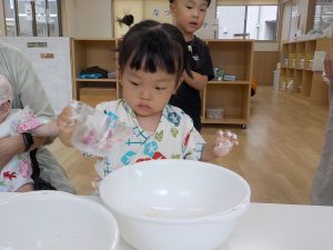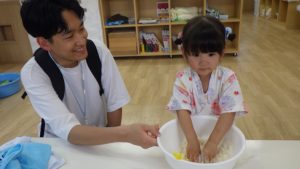 小麦粉粘土コーナーでは、小麦粉と水と油を混ぜて小麦粉粘土を作りました。粉のサラサラとした感触から水を加えてベタベタと感触が変わることに驚いた表情を見せたり、こね続けて柔らかくなってくると「気持ちいいよ!」と言葉にしながら感触を楽しんだり、できた小麦粉粘土をちぎったりして楽しんでいました。