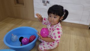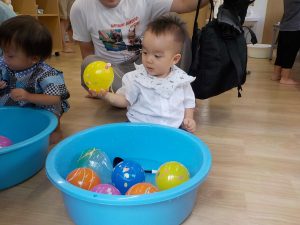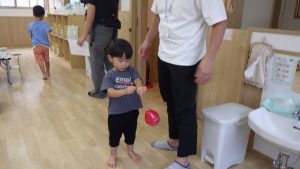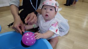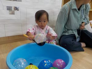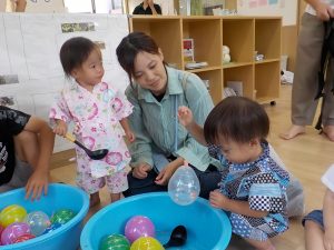 ヨーヨー釣りコーナーでは自分の好きな色をじっくりと選び、おたまですくうことができると「やったー!」と嬉しそうにしていました。