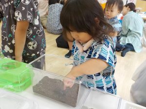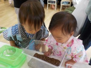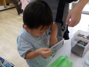 虫の展示では、実際に保育園の近くの公園にある木の枝や、虫を展示しました。虫籠の中にいるカブトムシやクワガタを見て「触ってみたい!」と触れてみる姿もありました。ちょうちょを見ると、「ぱたぱた!」と羽の動きを真似する仕草をして楽しむ姿もありました。蝉の抜け殻は「あ、これ知ってるよ。蝉のからっぽ!」と言いながら木の枝につけて楽しんでいました。
