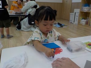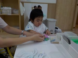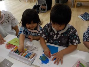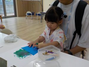 アイス作りコーナーでは、絵の具遊びで子どもたちが画用紙に自由に色を乗せたものを使用して製作をしていきました。子どもたちは自分で色を乗せた画用紙を見て、保護者の方へ「これやったんだよ!」とその時の体験を嬉しそうに伝えながら作る姿もありました。クレヨンで色が付いたり線がかけることを楽しみながら夢中で取り組み、出来上がったアイスを「あむ。」と食べる仕草をする子もいました。