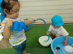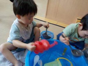 顔にかかる水に最初は驚く姿もありましたが、水の気持ちよさ、水遊びの楽しさを感じることで、水面を叩いて水しぶきをあげたり、お玉やコップを使って自分の手足にかけたりする姿が見られていました。また、色水遊びで繰り返し水の移し替えを行っていたことで、水遊びの中でも”こぼさないように”と使う玩具を選び、玩具の角度を調整する等して真剣な表情で移し替えを行う姿がありました。