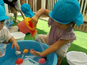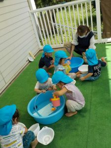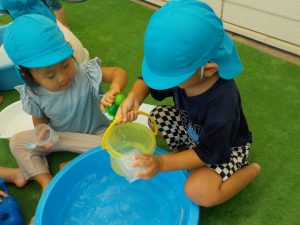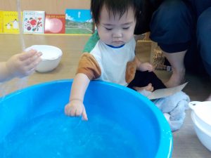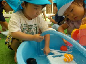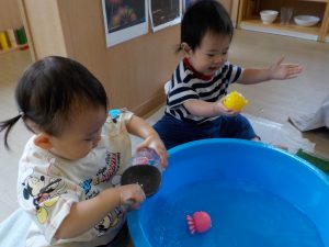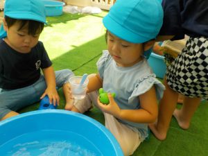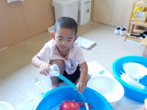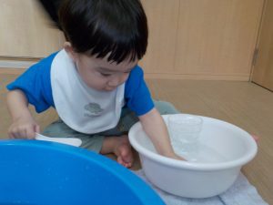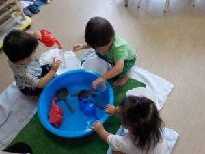 水遊びを行う期間は終わってしまいましたが、引き続き水に触れる機会を重ねていくことのできるように、子どもたちの興味、発達に合わせた遊びを設けていきたいと思います。