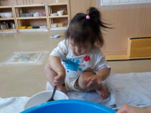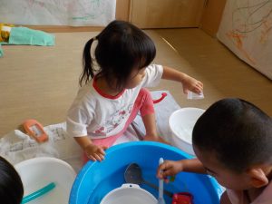 水そのものに触れる際も怖がることなく、興味を持って触れています。水をレンゲで掬う、上から流す、移し替える等してじっくりと水の観察を行う姿が印象的でした。