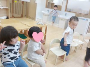 後日。誕生児が誕生日会をした時のようにイスを並べているのを見たつき組さんたちは、並べてあったイスに座り、誕生日表を指さしていたので一緒に”ハッピーバースデー”を歌い楽しみました。祝ってもらった嬉しさからもう一度行っているのかなと思うと嬉しい気持ちです。