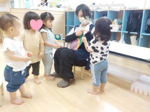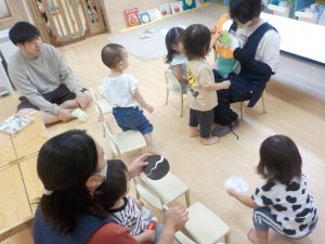 「まあるいたまごが♩」と歌を歌い、たまごがパカッと開くと中から恐竜やひよこ、アリ等子どもたちが普段から図鑑で見たり口にしているが出てくると「あっ!」と指をさして”知ってる!”と言った反応でペープサートに手をのばし、十分に触れて楽しんでいました。