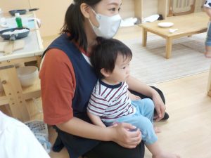 安心できる保育者の膝や抱っこ等、それぞれ安心できる方法で参加することで興味を持ち、目を向けていました。