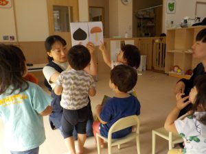 保育者からはこの時期にちなんだ秋の生き物や食べ物を題材にしたお話をしました。