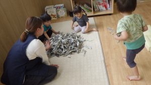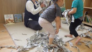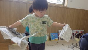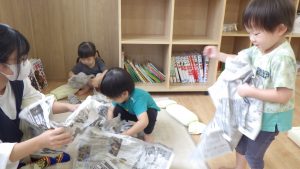 新聞紙の感触や音や、丸めたり破いたりすることで自由な発想を楽しんだり、指先を使うことで手先の器用さを育む遊びの一つとして新聞紙遊びを行いました。