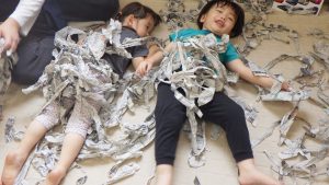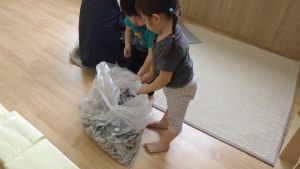 沢山新聞紙で遊んだ後、保育者が袋に新聞紙を入れ始めると子どもたちも率先して新聞紙を袋に入れてくれました。