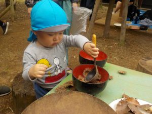 少しずつ慣れてくると、秋の自然物を使っておままごとをしたり、水を使って泥遊びをしたりと
