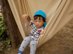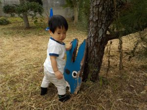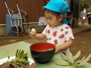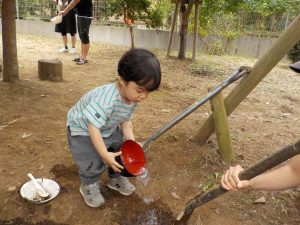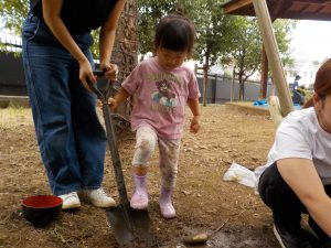 沢山の人に緊張している姿が見られていましたが、友だちを見つけると少しずつ表情がほぐれていました。そら組の子どもたちは、あそびの森DAYへの参加の回数を重ねてきたこともあり、何がどこにあるのか、何ができる場所なのかを把握していることから、「むしつかまえる」と虫取り網を手に取ったり、ジョウロやスコップを手に取ると穴を掘って水を溜めてみたりと自分で遊びを見つけて夢中になっていました。