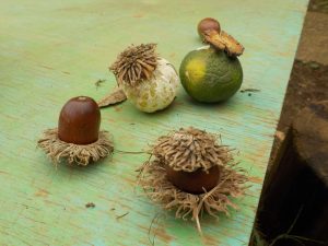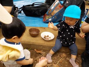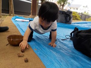 初めは保護者の方の膝や東屋に座っている姿もありましたが、興味のある昆虫を見つけると徐々に自分から行動し始め、昆虫や葉っぱ、ドングリなどを指差したり、つまんだりしています。丸太の下にミミズやワラジムシなどがいることを伝えると、驚いた様子が見られていましたが、保育者が触っていることや保護者の方と一緒という安心感からワラジムシやダンゴムシに触れてみる姿がありました。
