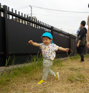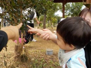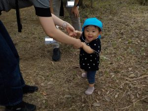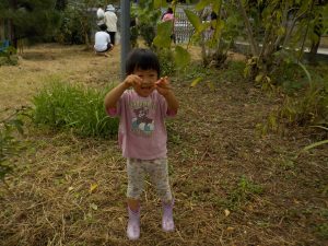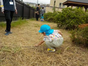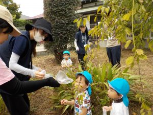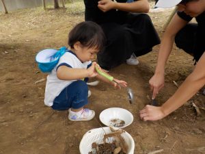 コオロギやキリギリス等の今の時期ならではの昆虫にも出会いました。しゃがんで探しながら、「いないね」と話していた子も保護者の方や保育者と一緒に探し昆虫を見つけられると「いたね」と嬉しそうにしていました。