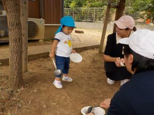 穴に水を入れて遊んでいるお友達がいることに気付くと、次々とそら組の子どもたちが一つの場所に集まる様子がありました。スコップで穴を大きくする子、泥を掬って容器に入れる子などそれぞれに興味のあることを見つけて遊んでいます。つき組の頃に比べて道具を使う姿も増え、皿に乗せたい泥団子の大きさに合わせて器の大きさを変えたり、水を運ぶにはジョウロ、穴を掘るためにはレンゲよりスコップと目的によって選び使い分けるようになってきています。