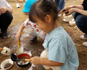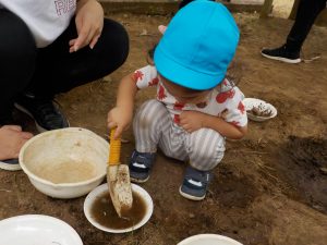 土や泥遊びに夢中になる姿も多く見られていました。大きなジョウロやお玉を保護者の方と一緒に使って、水と土を混ぜたり盛り付けたりし、様々な道具の使い方を試しています。