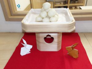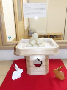 10月の室内装飾は「十五夜」をテーマに、月見だんごと折り紙で作ったウサギを飾っています。