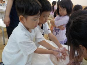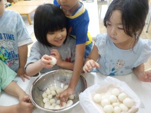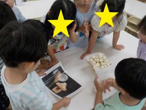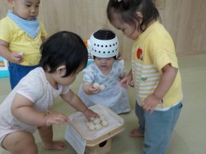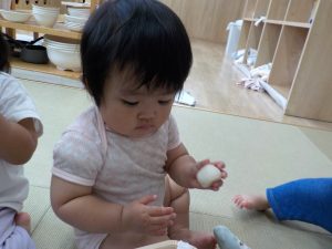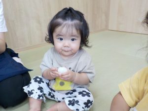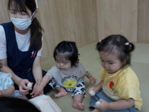 飾った月見だんごに興味津々な0歳児クラスの子どもたち。だんごを手に取り、愛着形成を築いた保育者に見せてくれたり、匂いを嗅いでみたり、観察を楽しんでいました。