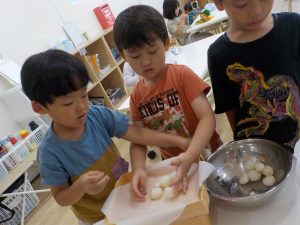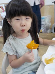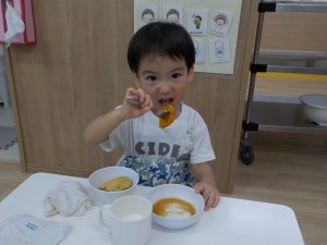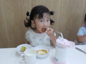 10月6日、十五夜当日は、おやつにカボチャでつくった月見だんごを提供しています。旬の食材を取り入れた行事食に、子どもたちも「美味しい!」と笑顔で食べ進める姿がありました。