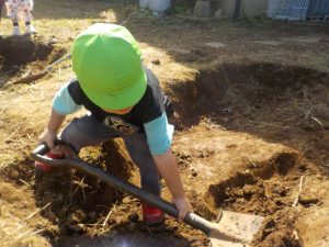 あそびの森では、おうちの方に「ここで木登りするんだよ」「ここはね…」などと紹介しながら遊ぶ姿や、秋らしい木々や植物に囲まれて、どんぐりを使ってお料理を作ったり、おうちの人と一緒に穴を掘ったりとたくさん体を動かし、頭を使いながら遊んでいました。