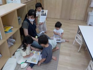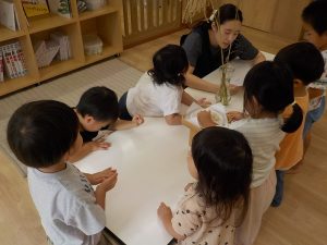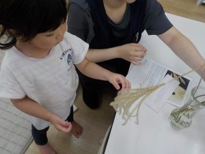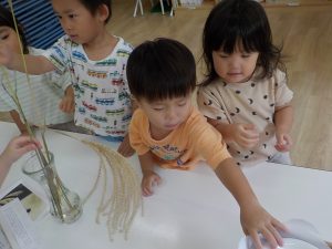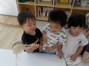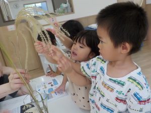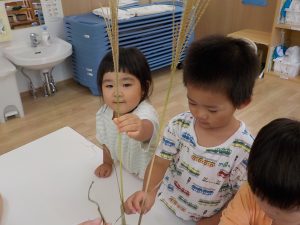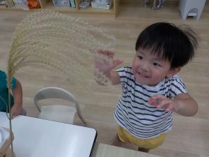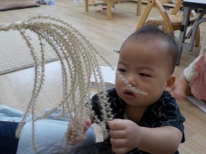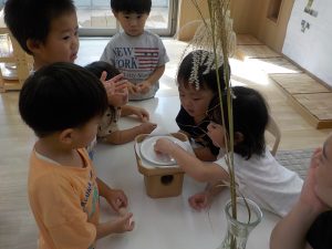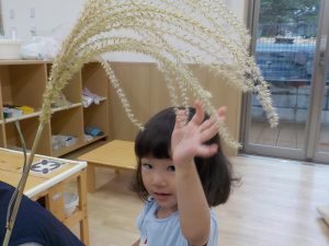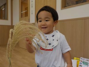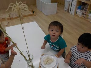 後日玄関に飾られたススキとお月見団子に気付いた子どもたち。ススキに触れると「フワフワしてる!」や「ここ触ってみて!硬いよ!」「本当だ、硬いね!」と感触を子どもたち同士で共有する姿がありました。団子を見た時には「あれ?硬いね。」「コンコンって音がする。」と触れて机に落としてしまった時に聞こえた音に気付き、伝える姿もありました。「茹でてすぐはやわらかかったけど、時間が経つと硬くなるんだね。」と気付きや違いも共有していきました。美味しい食べ物が食べられることへの感謝や、今後も美味しい食べ物が食べられるように願いを込めてお願いを込めてお供えすること、十五夜は一番きれいな満月が見える日であることを伝えると「6日にお月様見ようね。」等伝える様子も見られました。体験を通して行事を身近に感じ、理解が深められるよう関わっていきました。