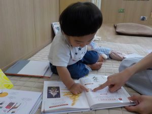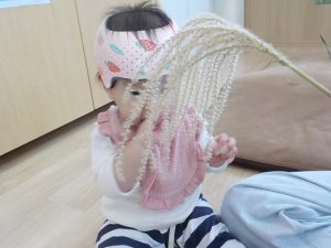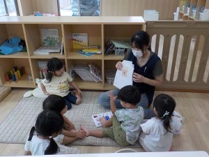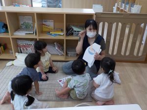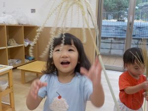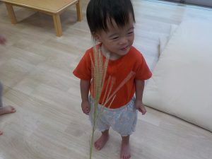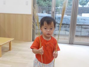 つき組では、保育者がススキとお月見団子を保育室に持ってくるとススキを見て「おっきいね!」「これは何?」やお月見団子を見て「お団子だ!」と興味を示す姿がありました。「ススキって言うんだよ」「触ってみる?」という保育者の声掛けに対し「ふわふわしてるね。」「木みたい。」と感じたことを伝えてくれました。お月見団子はそら組さんが作ってくれたことを伝えると、「どうやって作ったの?」と作り方に興味を示す様子もありました。「粉とお水を混ぜてこねこねしたんだよ。」と伝えると「こねこね?」と手で団子を転がしていました。また、十五夜について、ありがとうの気持ちと美味しいものが食べられますようにという願いが込められていることをわかりやすく伝えると、手を合わせて「ありがとう」と言ったり、「食べられますように!」と保育者の言葉を真似してお願いをしていました。今後も子どもたちの興味に寄り添いながら分かりやすく日本の文化や伝統について伝えていきます。