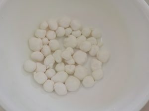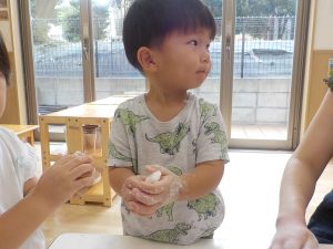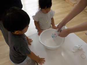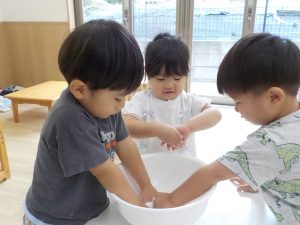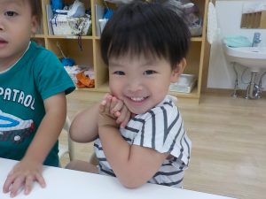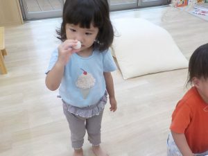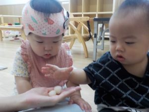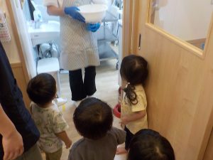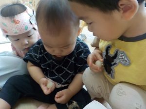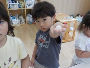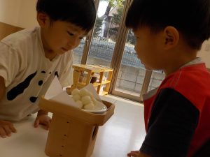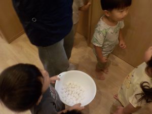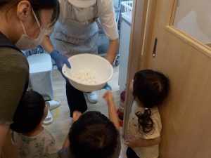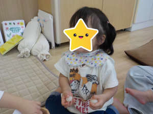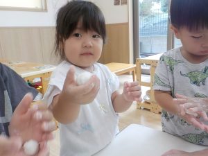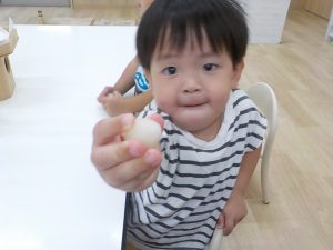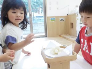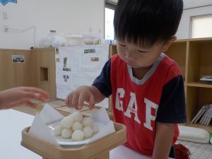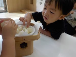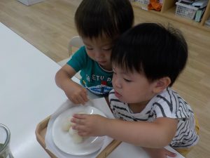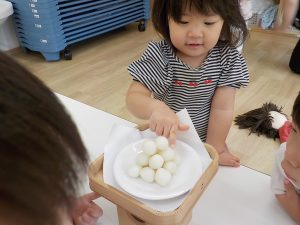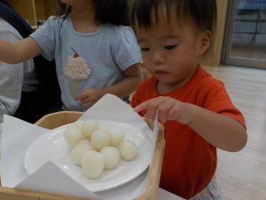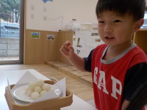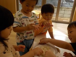 子どもたちの丸めたお団子は、調理さんに茹でていただきました。「お団子どうなった?」「ゆで終わった?」と気にしている様子の子どもたち。茹で終わったお団子を見て触れると「もちもちだ!」「やわらかいね。」と感触を言葉にしたり「できた!」「ちっちゃいの僕が作ったの!」等伝える子どもたちの嬉しさや達成感を一緒に共感していきました。