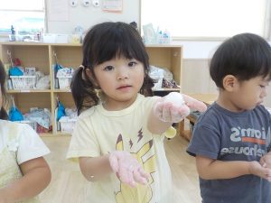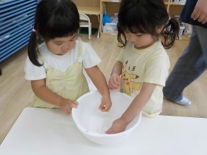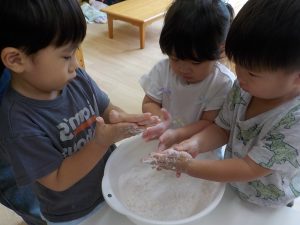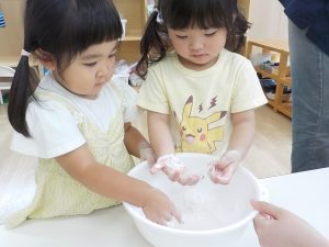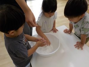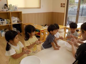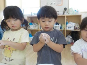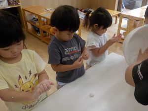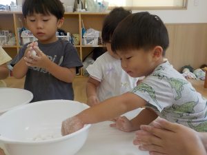 そら組では、装飾のお月見団子作りをしました。事前にお月見団子作りをすることを伝えていたことで、「どうやって作るの?」や「何入れるの?」等興味を示し、当日の朝の会では、保育者が用意した写真を見せながら材料や作り方を伝えると、真剣なまなざしで聞く姿も見られました。作っていく中で、「これが上新粉?白いね。」や「サラサラしてる!」「丸くなってきたよ!」と感じたことや変化を伝えてくれました。自分なりの丸になるように何度も挑戦する子どもたちを温かく見守っていきました。