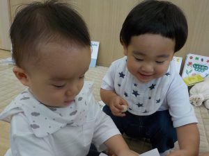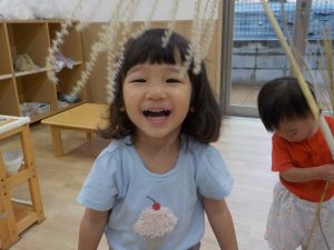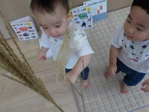 ほし組では、室内から装飾のススキが見えると、指をさしたり「っぱ!」と言葉にして興味を示していました。ススキとお月見団子を見ると、近付いて触れてみていました。保育者が「ふわふわしてるね。」とススキに触れると、子どもたちも「ふわふわ」と言葉にしながら触れたり、お月見団子が床にコロコロと転がると、面白かった様で「きゃっきゃっ!」と笑う姿もありました。「十五夜はお月様がとても綺麗に見える日なんだよ。」と伝えると、窓からお月様を探す姿があり、ちょうどお月様が見えて、指をさして嬉しそうに「あった!」と伝えてくれましたよ。