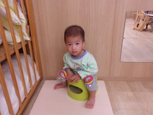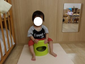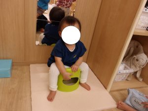 お部屋におまるを設置してあります。最初は「これは何かな?」と興味を示し、持ってみたり触れていました。保育者が座る事を伝えると少しずつ座る姿も見られます。保育者が『しーしー』と言葉にすると『しーしー』と言いながら体を左右に揺らす姿も見られます。歩行が確立したあと、まずは排泄(おまるやトイレ)に子どもが興味を持てるように関わることが大切です。そして、大人の真似が大好きな時期です!大人の排泄をみると、興味を示して、同じように座ってみたいと思ったり、トイレットペーパーを取ってみたり…これが排泄の自立に向けてのチャンスです。
