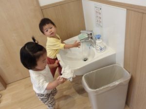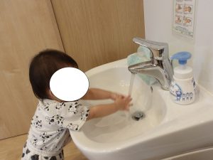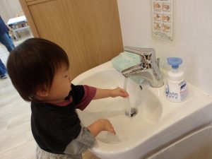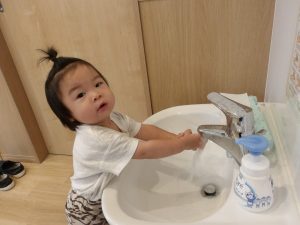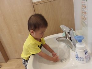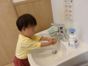 保育者が手を洗う姿を見せると模倣して手をこすり合わせたり、泡が水に流れていくのを見て興味を示していました。水への興味や好奇心の高まりですね!