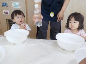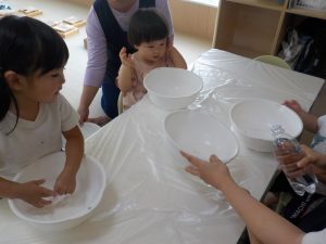 お月見に関する絵本を読み、興味を持った子からお団子の粉を触り感触を確かめます。