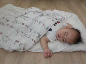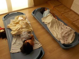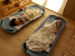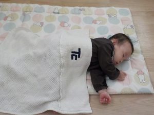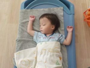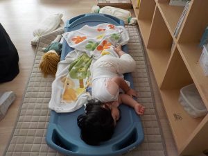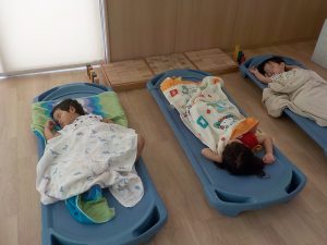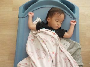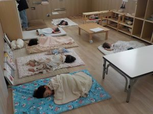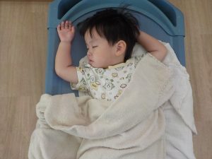 室内環境は、室温・湿度・部屋の明るさなどにも配慮しています。午睡中は午睡チェック(0歳児:5分おき、1歳児:10分おき、2歳児:20分おき)を行い、一人一人の呼吸・顔色・体温・汗・体位(仰向け、横向き、うつ伏せ)等を確認し、安全に配慮した中で睡眠が摂れるようにしています。うつぶせ寝を確認した際には、すぐに呼吸のしやすい姿勢にしています。
