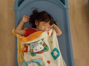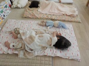 園では、一人一人に合わせて安心して睡眠に向かい、心地よい環境の中で身体を休めることが出来るように関わっています。午睡に入る前には、それぞれの様子に合わせて保育者とスキンシップをしたり、落ち着いて過ごせる関わりの中で、子どもたちが心地よさを感じ、睡眠に向かえるように関わっています。赤ちゃん人形と一緒に横になり、安心して眠る姿もありますよ。