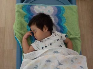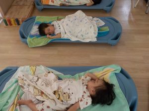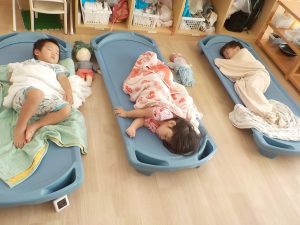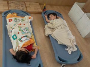 子どもの成長に重要なのは、夜の睡眠です。睡眠中は脳を休め、代謝を促したり筋肉や骨をつくったり、ケガや病気を回復させたり、記憶を確かなものにする等の重要な役割を果たしています。保育園での午睡は夜の睡眠の妨げにならないようにとり、夜の睡眠を補う時間になっています。午睡の時間で脳と身体を休めることによって、午後の活動も意欲的な様子が見られています。今後も、一人一人に寄り添った午睡が行えるようにしていきたいと思います。ご家庭での困ったこと等ありましたら、いつでもご相談ください。ご家庭での様子と合わせて、24時間を通した睡眠のリズムを整えられるように、一緒に考えていけたらと思います。