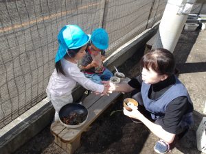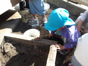 そら組では先日秋の遠足がありました。その時の様子をお伝えします。子どもたちからのリクエストで「お庭がいい!」とのことで、お庭で過ごすことにしたそら組。お庭では保育者やほし組さんが拾ってきたどんぐりをお庭に設置し、季節ならではの物に触れながら遊んでいました。どんぐりは食材に見立てたり、見立てたお料理をお店屋さんごっことして、保育者やお友達と楽しむ姿が見られました。