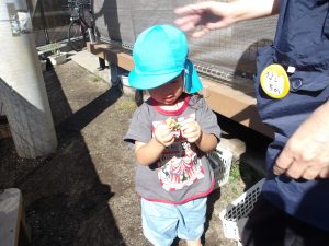 お昼の時間になるとみんなが楽しみにしていたお弁当の時間です♪テラスに移動して大好きな保護者の方に作ってもらったお弁当を美味しそうに頬張る姿がありました。『おにぎりが入っていたよ・卵焼きが入っていた・ぶどうがあったよ』など、身近にいる保育者や他児にとても嬉しそうに伝えていました。