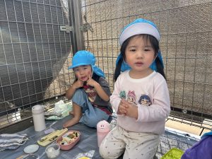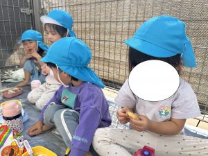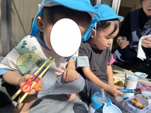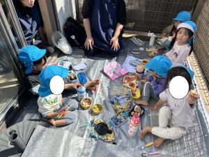 お昼の時間になるとみんなが楽しみにしていたお弁当の時間です♪テラスに移動して大好きな保護者の方に作ってもらったお弁当を美味しそうに頬張る姿がありました。『おにぎりが入っていたよ・卵焼きが入っていた・ぶどうがあったよ』など、身近にいる保育者や他児にとても嬉しそうに伝えていました。