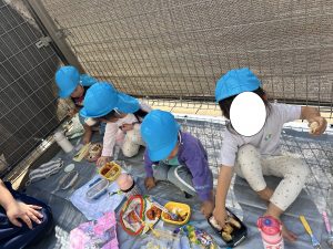 お花や葉っぱに触れて自分のイメージした事を遊びの中に取り入れ、様々な道具も使って自由に表現する事を楽しんでいました。