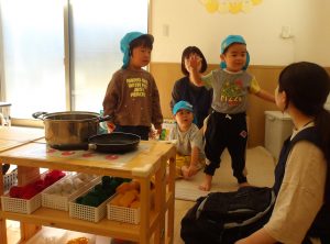 「ママと○○ちゃんとたまごやき作ったんだよ!」「まぜまぜしたんだ~!」とお家の人と一緒に
