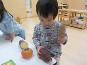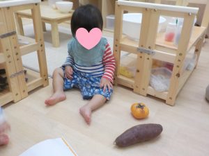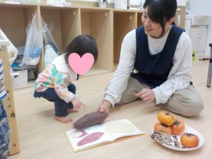 さつまいもを見ると”やさいのおなか””あきといえば”の絵本を持ってきてました。繰り返し一緒に見る中で載っていることを覚えていたようです。