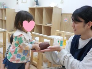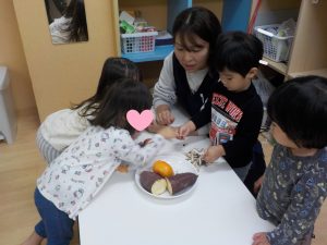 保育者が「おいもだね」とやりとりをすると言葉を聞き、「おいも、おいも!」と言葉を繰り返して食材と一緒に言葉にも親しみました。