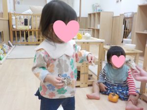 さっそく手をのばす子、なんだろうといった表情で保育者や他児が触れているのを眺めている子とそれぞれでした。