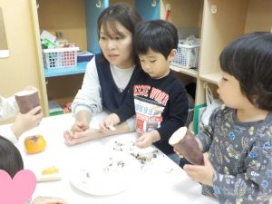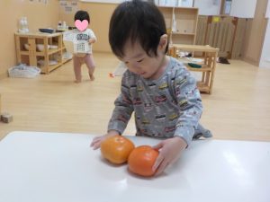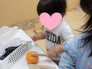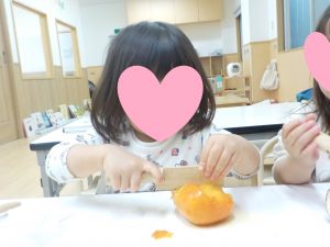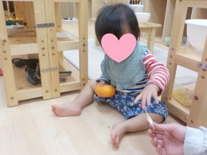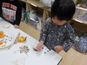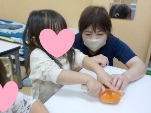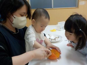 切れず難しい時には保育者の手を持っていき、ジェスチャーで伝え、一緒に包丁で切るとどうなっているのか中を確認したり、手で触れ感触を楽しむ子と様々でした。