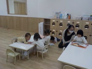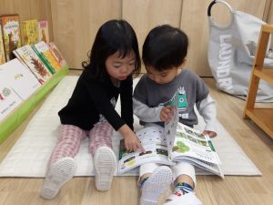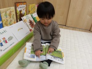 絵本や図鑑を一緒に共有しているうちに、自然と子ども同士の会話も増え、楽しむ姿が見られていますよ。今後も絵本に親しむ時間を大切にしていきたいと思います!